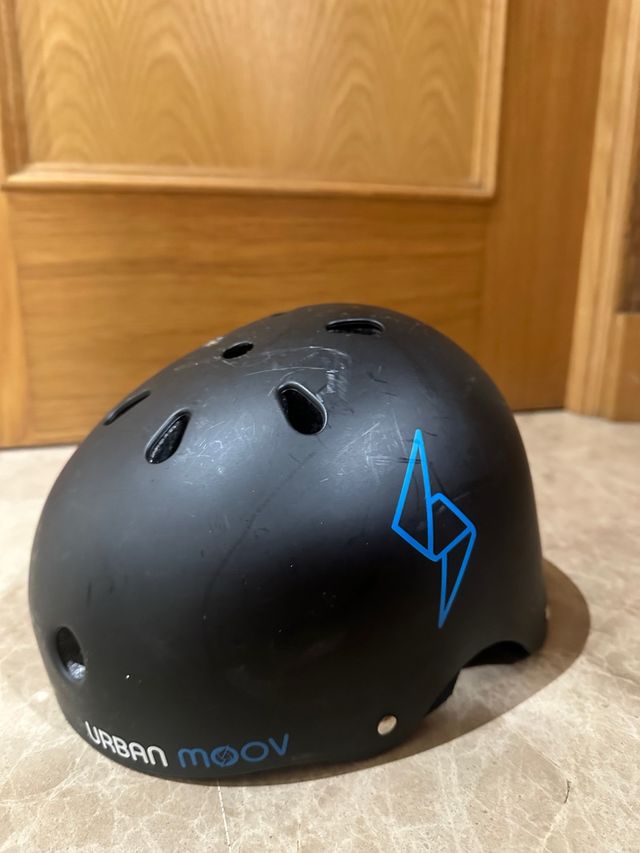 Detalles del productoCasco negro de la marca Urban Moov, ideal para patín o bicicleta. Presenta un diseño moderno con detalles en azul.
