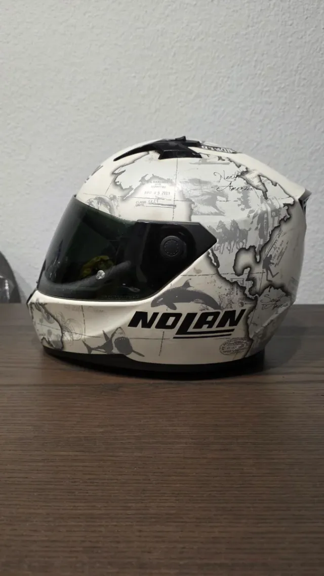 Casco integral NOLAN con diseño de mapa del mundo y animales marinos. Talla S - Réplica de Carlos Checa. - Visera oscura. - Diseño gráfico detallado.