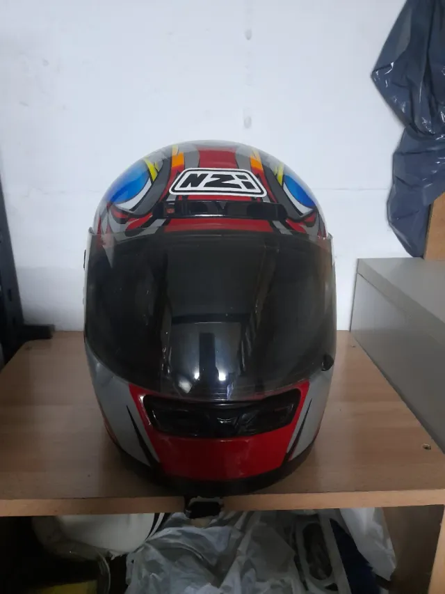 Casco de moto con un diseño llamativo. - Color principal gris con detalles en rojo. - Visera oscura. - Logo de la marca NZ en la parte superior.
