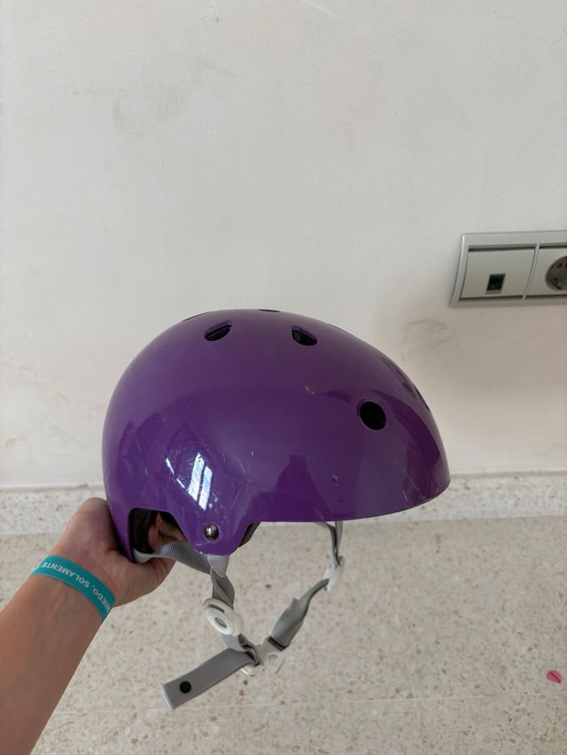 Detalles del productoCasco de la marca Oxelo, color morado. Está en buen estado, aunque tiene algunas marcas de uso.