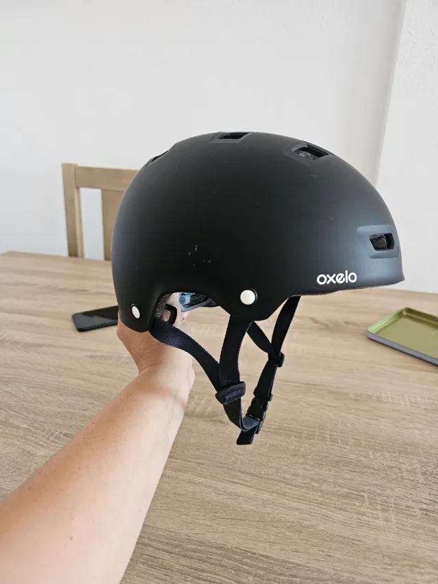 Detalles del productoCasco negro de la marca Oxelo, ideal para patinete eléctrico o bicicleta.