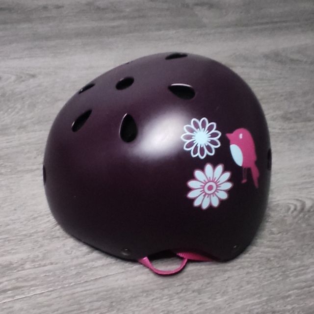 Casco Decathlon para niña en color morado oscuro con detalles floreados . Usado pero en buen estado. Con leves signos de uso. Tamaño 54-58 cm y peso de 360g