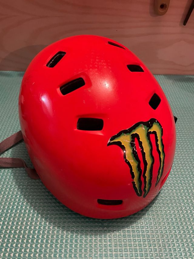 Detalles del productoCasco protector de color rojo, ideal para patinar o montar en monopatín. Presenta un diseño llamativo con el logo de Monster Energy.