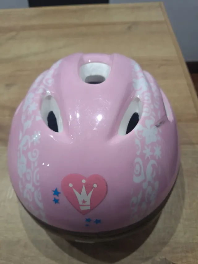 Casco de bicicleta infantil en color rosa con un bonito diseño. - Decoración con un corazón y una corona. - Estampado floral blanco. - Estrellas azules decorativas.