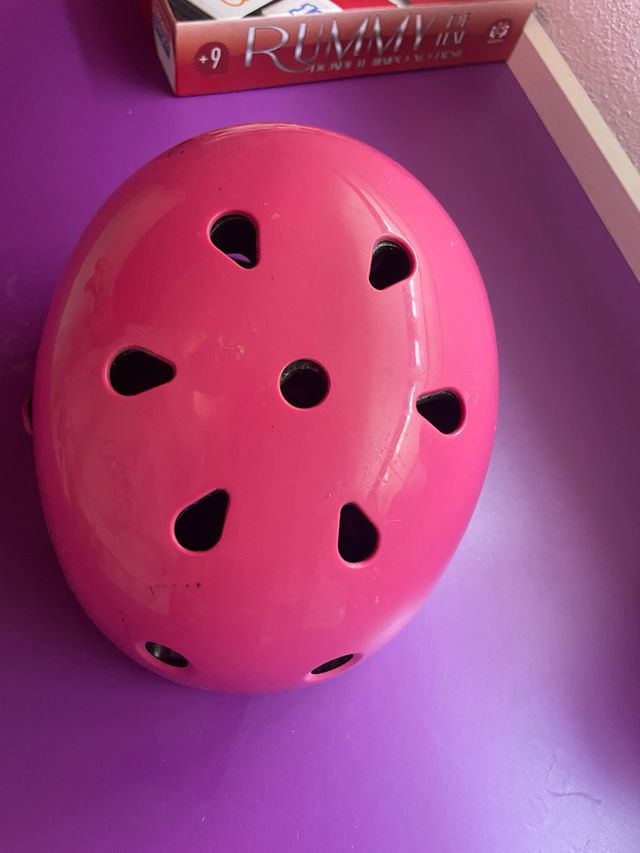 Detalles del productoCasco de bicicleta para niña, en color rosa. Es un casco ligero y aparentemente está en buen estado.