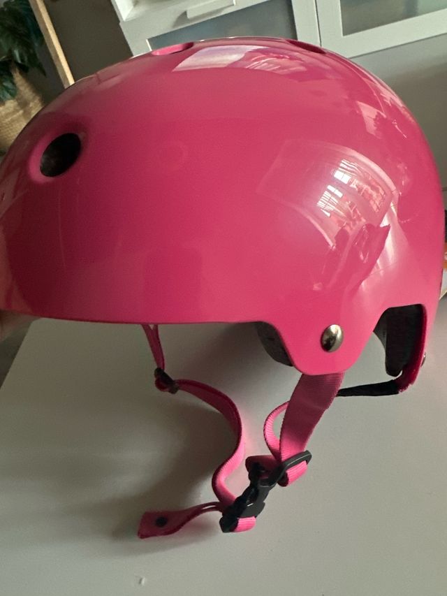 Casco de protección en color rosa, talla M. Ideal para actividades deportivas. - Diseño brillante. - Cierre de hebilla ajustable. - Acolchado interior.
