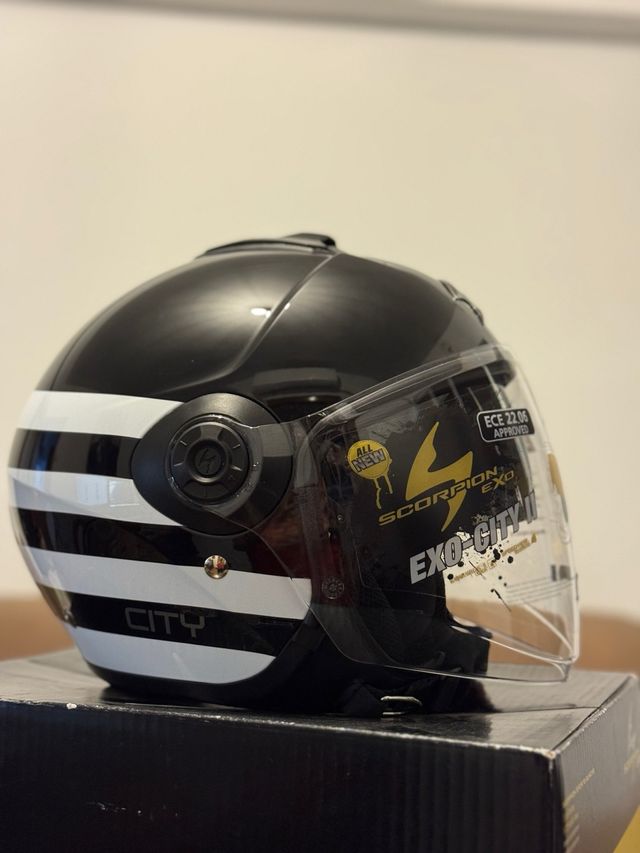 Casco jet Scorpion Exo-City II con un diseño llamativo. - Talla XS. - Diseño Bee con rayas blancas y negras. - Visera transparente.