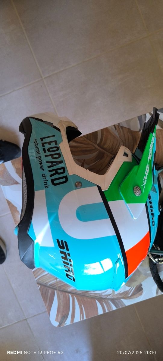 Detalles del productoCasco de motocross y enduro Shiro Leopard en color turquesa y verde. Está en muy buen estado. Sólo 3 puestas y de regalo dos petos collarín y gafa