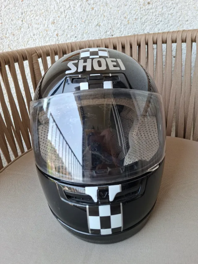 Casco de moto Shoei con un diseño clásico estilo café racer.talla M - Color negro brillante. - Detalles a cuadros blancos y negros. - Visera transparente.