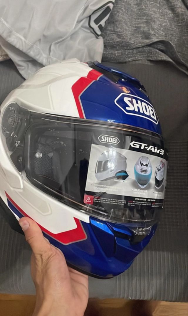 Casco integral Shoei GT-Air 3 con diseño Realm TC-10. - Color blanco, azul y rojo. - Visera transparente.