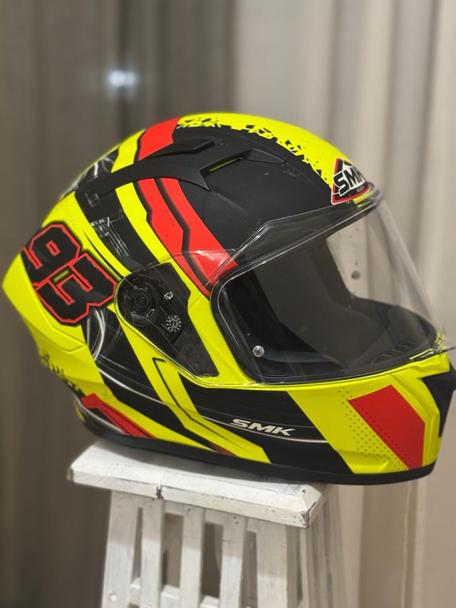 Detalles del productoCasco integral SMK con un diseño llamativo en amarillo, negro y detalles rojos. Muy poco uso, practicamente nuevo. Tiene funda de transporte