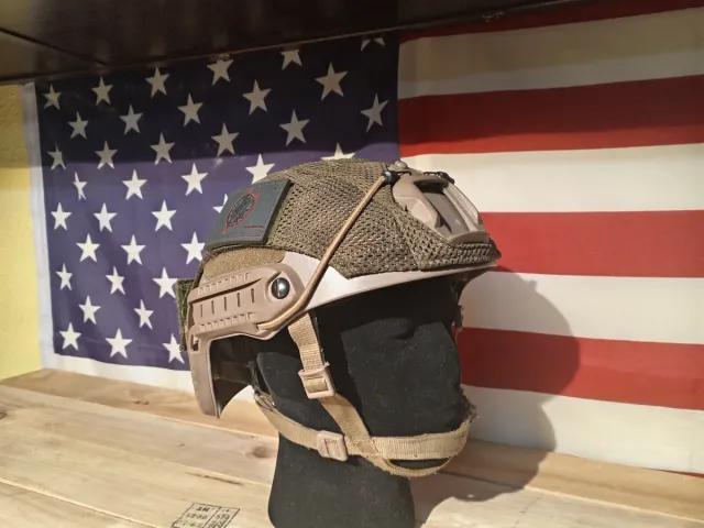Detalles del productoCasco táctico FMA con cubierta de malla y sistema de rieles.