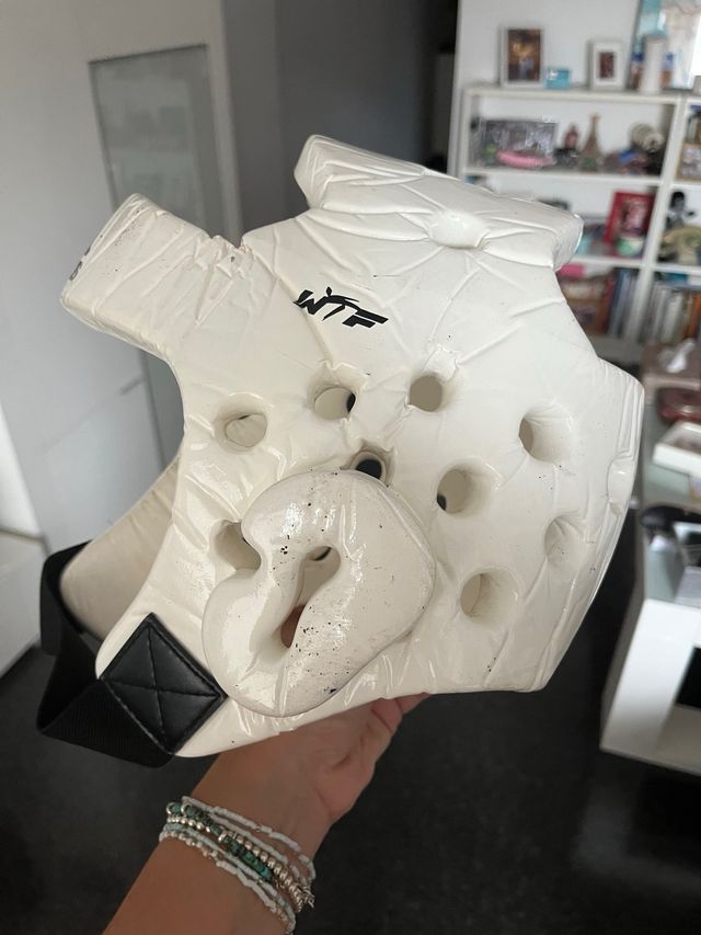 Casco de protección para la práctica de taekwondo, con certificación WTF. - Color blanco. - Diseño con orificios para ventilación. - Cierre ajustable.