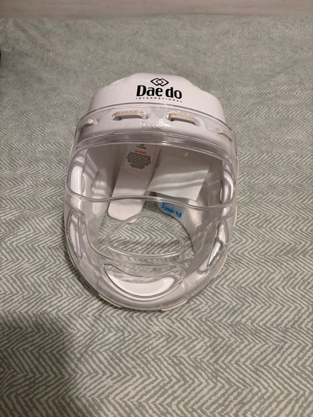 Casco de protección para Taekwondo de la marca Daedo. Talla M - Color blanco. - Diseño con protección facial transparente. - Cierre ajustable.
