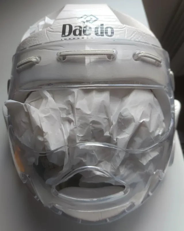 Casco de protección para taekwondo de la marca Daedo. - Diseño de protección facial transparente. - Cierre con cordones. - Color blanco.