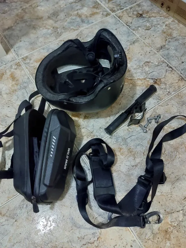 Lote de accesorios para patinete. - Casco negro. - Bolsa de transporte negra WILD MAN. - Manillar. - Correa de transporte.