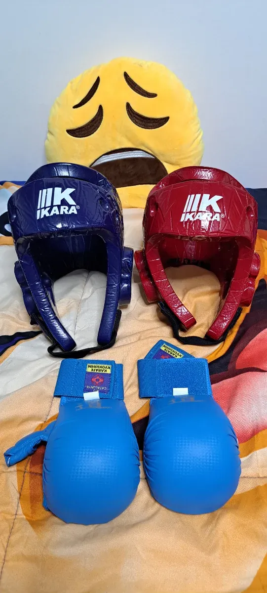 Set de protección para karate marca IKARA. - Casco protector azul. - Casco protector rojo. - Guantes de protección azules. 5 € por pieza.