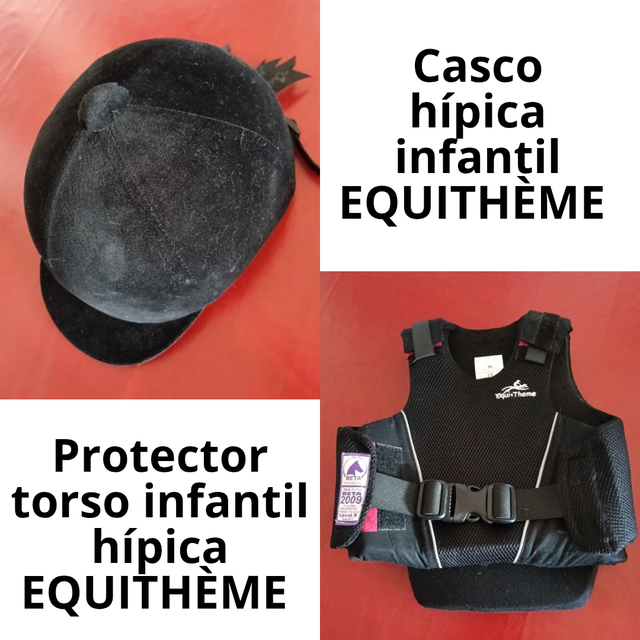 Detalles del producto🏇 Conjunto nuevo de equipamiento de equitación para niños de la marca Equithème. Incluye casco de hípica de terciopelo y protector de torso regulable que se puede lavar.
