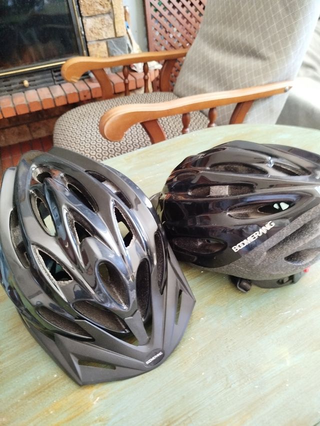 Dos cascos de bicicleta de la marca Boomerang. - Diseño aerodinámico. - Color negro brillante. - Talla S/M. - Usados una sola vez. - Unidad 12€