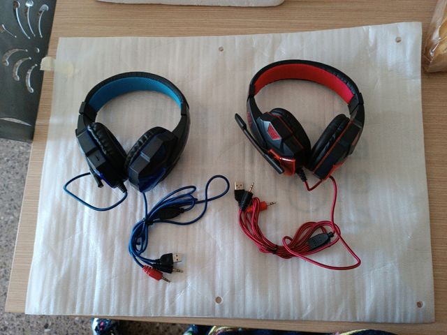Cascos azul y rojos , Son pequeños tienen luces al conectarlos al pc se escuchan muy bien , tiene algun rallajo pero no se llega a notar mucho
