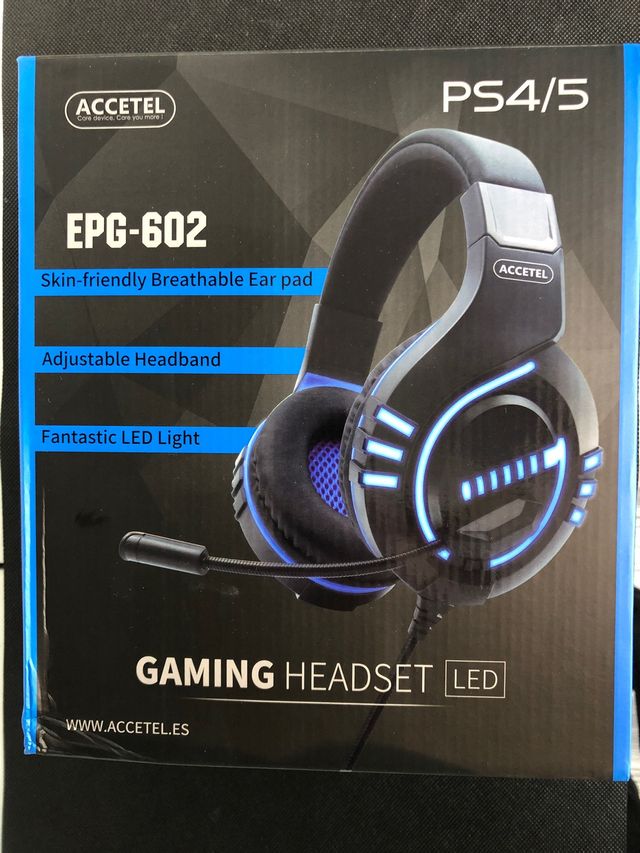 Detalles del productoCascos gaming ACCETEL EPG-602 con luces LED, compatibles con PS4 y PS5. Cuentan con almohadillas transpirables y diadema ajustable.