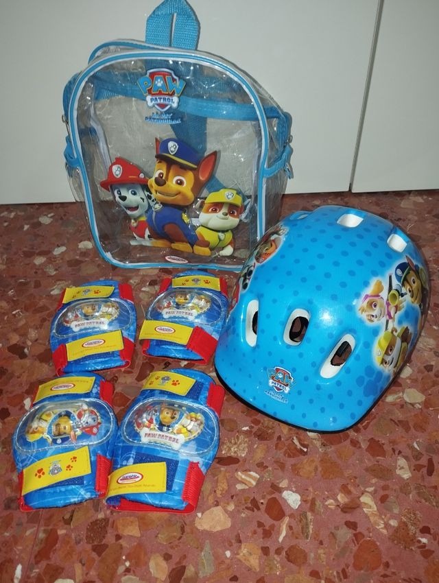Conjunto de casco y protectores de codos y rodillas con mochila de la patrulla canina. Talla S. ( 53-56 )