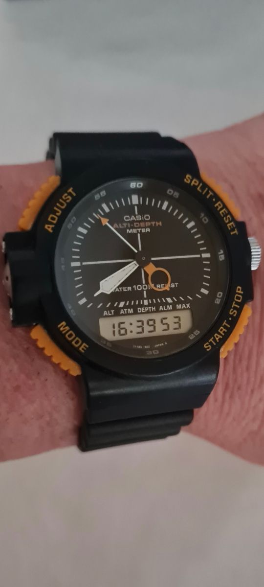 Detalles del productoReloj analógico-digital made in Japan de 1989 (módulo 376) con barómetro, altímetro, profundímetro...y en el estado estético que muestran las fotografías, que forman parte importante de la descripción. Sólo reseñar que algún tornillo de la tapa trasera está pasado, de tanto cambio de pila (por lo que no se garantiza hermetismo), y que el analógico a veces se para y se le ha soltado el segundero dentro. Sin estuche, documentación ni garantía por tratarse de un artículo usado vendido por particular. No envio por Wallapop. No se aceptan devoluciones ni cambios.