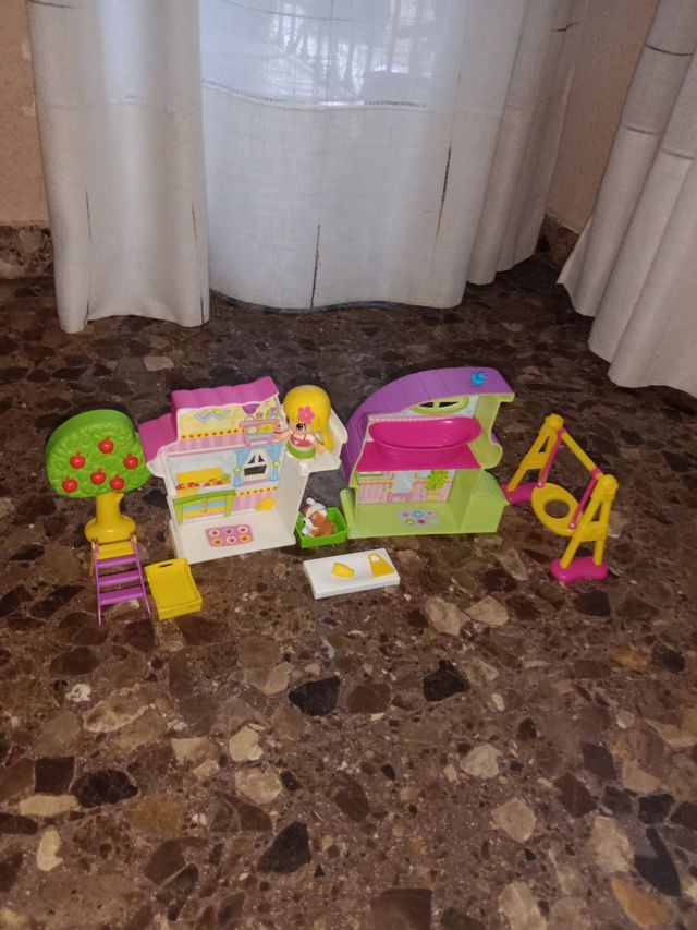 Lote de 2 casitas con figura y mascota Pinypon. Arbol,escalera y cesta para recoger manzanas. Columpio Bañera con jabón y cama