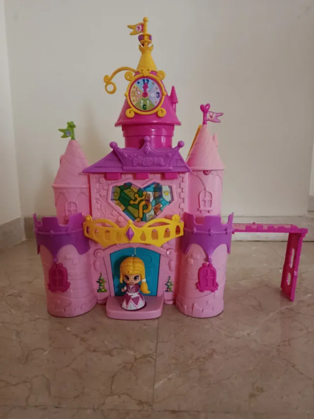 Detalles del productoCastillo de juguete Pinypon en color rosa, con detalles en morado y amarillo. Incluye una figura de princesa.