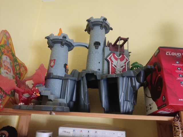 Set de juego de un castillo con un dragón rojo. - Castillo de juguete con torres y puente. - Figura de dragón rojo con alas.y tres playmobol