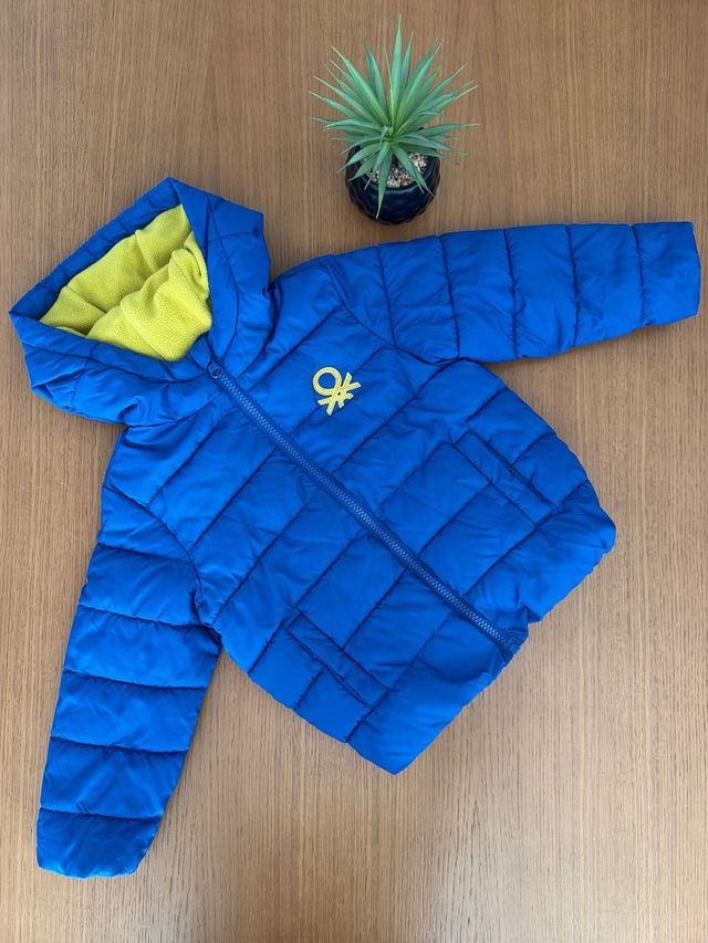 Cazadora de niño acolchada marca Benetton. Exterior azul e interior polar en amarillo mostaza. Cierre mediante cremallera. Talla: 2-3años (98cm). En buen estado.