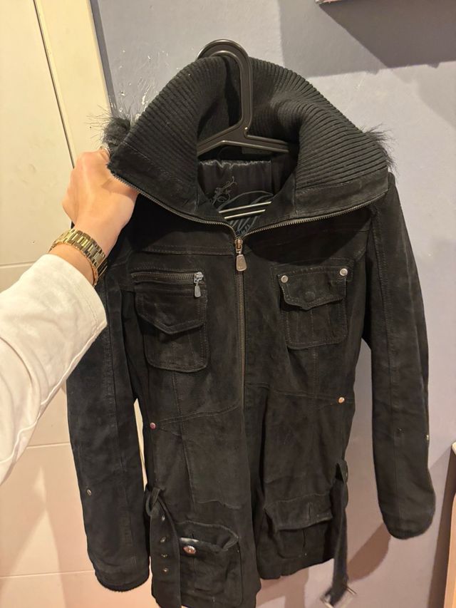 Cazadora de ante de tres cuartos con un diseño moderno y elegante.