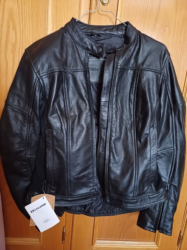 Detalles del productoChaqueta de cuero negra para moto de mujer, de la marca COURSE. Nueva con etiquetas. Con protección en hombros, codos y espalda. Talla S.