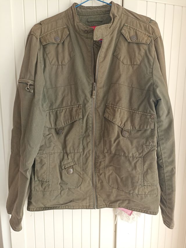 Jaqueta de hombre, de la marca Caramelo Jeans, tejido tipo tejano en color verde-caqui, sin forro, de algodón, para medio tiempo, multibolsillos, talla M. Todos los botones son los originales de la marca, grabados.
