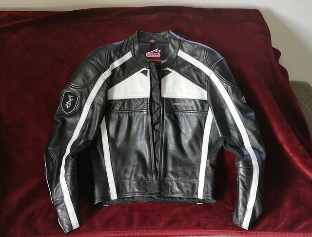 Cazadora de cuero para moto de la marca alemana Hein Gericke. Diseño deportivo con detalles en blanco. Piel de muy Buena Calidad. Como una talla S de hombre, en muy buen estado. Precio 100.