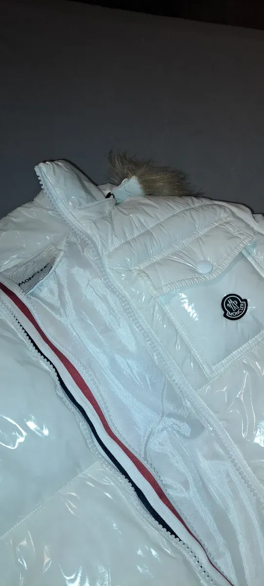 Cazadora Moncler blanca con detalles de marca. - Logo de Moncler en el bolsillo. - Cremallera frontal con detalles tricolor. - Capucha con pelo.