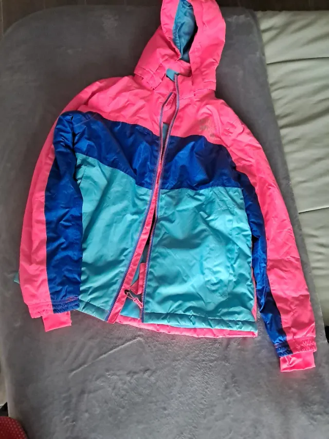 Cazadora de nieve para niña con un diseño colorido. - Combinación de colores rosa, azul y turquesa. - Capucha integrada. - Cierre de cremallera frontal.