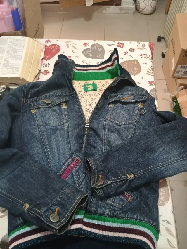 Cazadora vaquera con detalles coloridos. - Diseño con cremallera frontal. - Bolsillos en el pecho. - Puños con botones. - Bajo con rayas de colores.