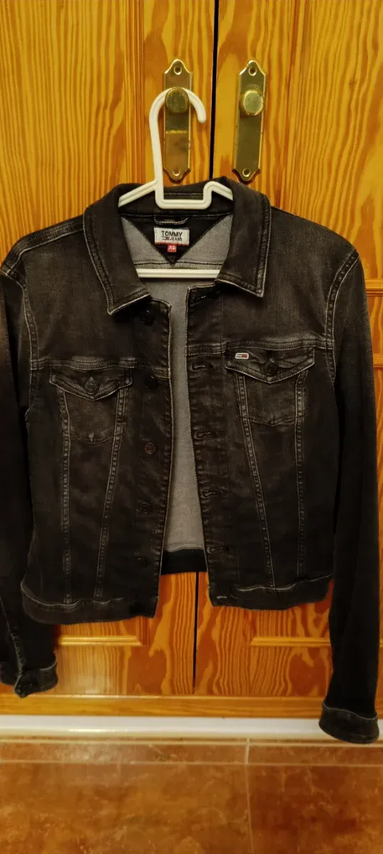 Cazadora vaquera de Tommy Hilfiger en talla XS negra acabado desgastado. Un básico de armario que combina con todo, Como nueva solo puesta dos veces.