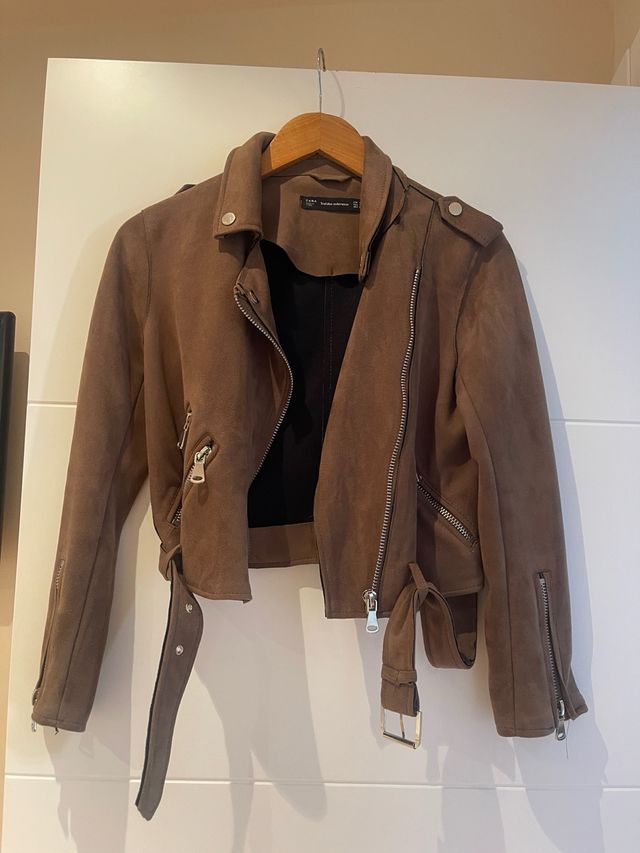 Cazadora estilo ante con cinturón. Talla S, tiene una mancha en la parte de atrás de la manga (se puede ver en la foto).