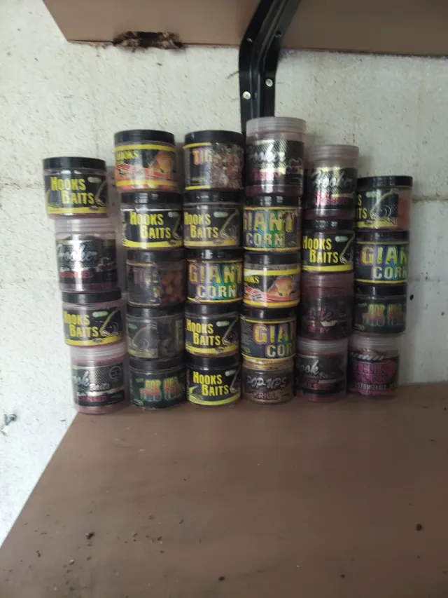 Lote de cebos de pesca de diferentes tipos y marcas. - Incluye cebos Hooks Baits. - También Giant Corn y Pop-Ups. - Variedad de colores y tamaños.