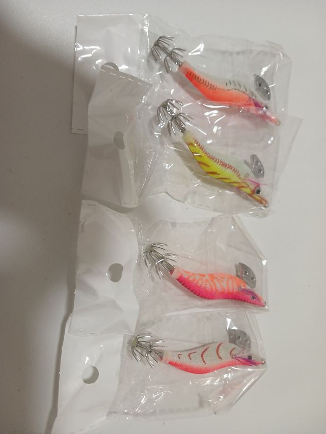 Detalles del productoLote de cebos artificiales para la pesca de sepia y calamar. Vienen en paquetes individuales para su conservación.