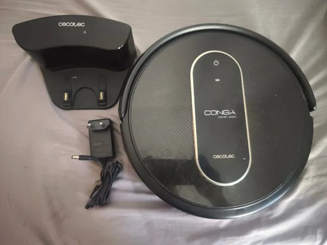 Detalles del productoRobot aspirador Cecotec Conga 1290 en color negro con acabado texturizado. Incluye su base de carga y adaptador de corriente.