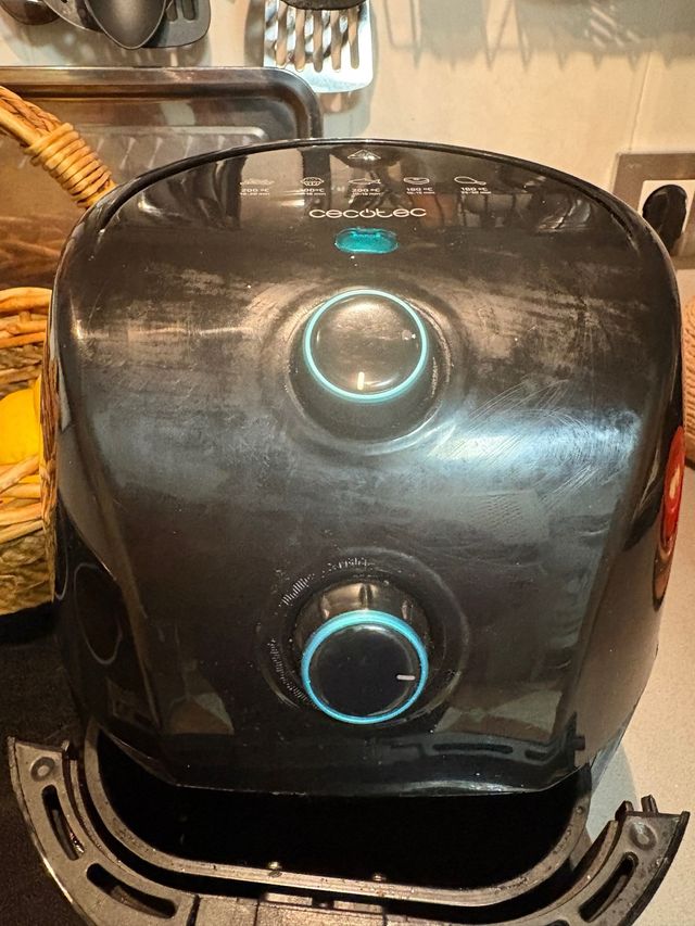 Detalles del productoFreidora de aire Cecotec en color negro. Cuenta con dos mandos giratorios para ajustar la temperatura y el tiempo.