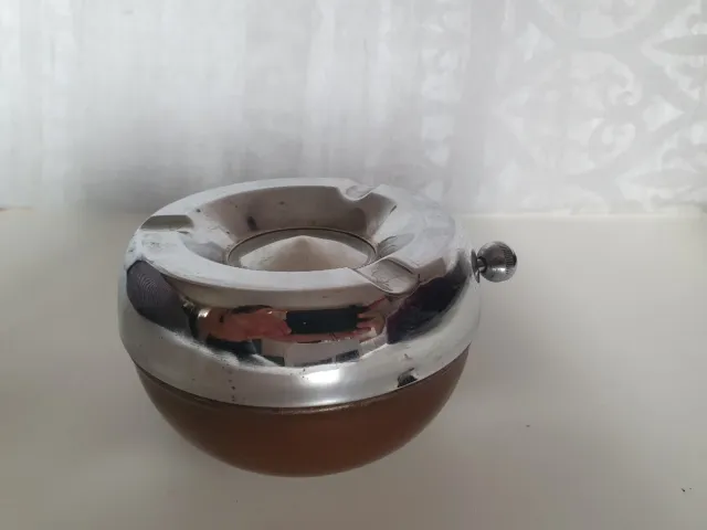 Cenicero vintage con un diseño giratorio y acabado cromado. - Parte inferior en tono marrón. - Mecanismo giratorio.