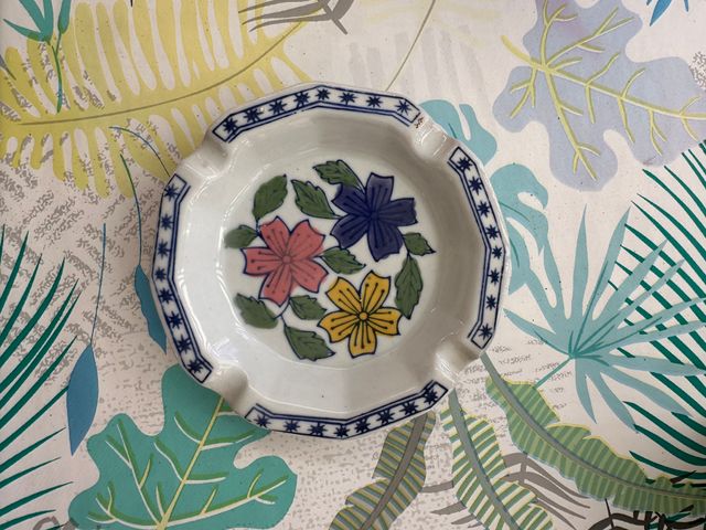 Detalles del productoCenicero de cerámica con decoración floral multicolor.