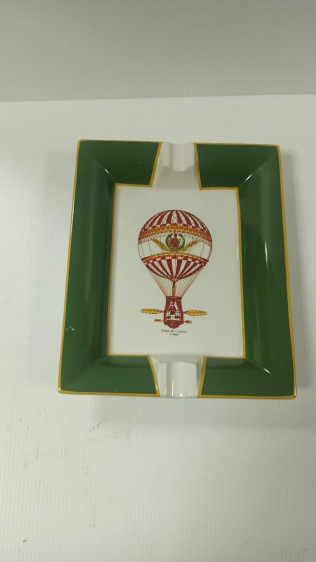 Cenicero de cerámica de La Cartuja con un diseño de globo aerostático. - Diseño de globo aerostático. - Borde verde con detalles dorados.