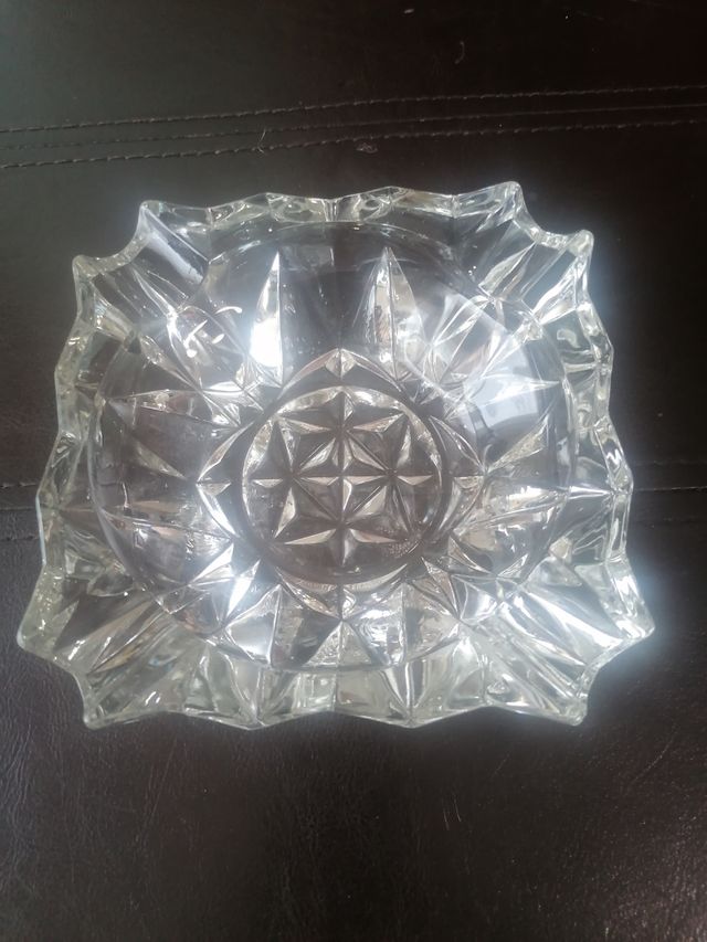 Detalles del productoCenicero vintage cuadrado, años 70, de cristal tallado, hay una inscripción que dice made in France. Pesa más de 650 gramos y mide 14x14 cm. En perfecto estado. Tendría otra unidad por si se quieren 2 iguales, serían 20 euros los dos.