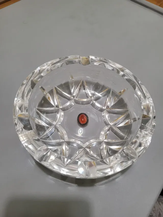Detalles del productoElegante cenicero de cristal con un diseño tallado que refleja la luz.