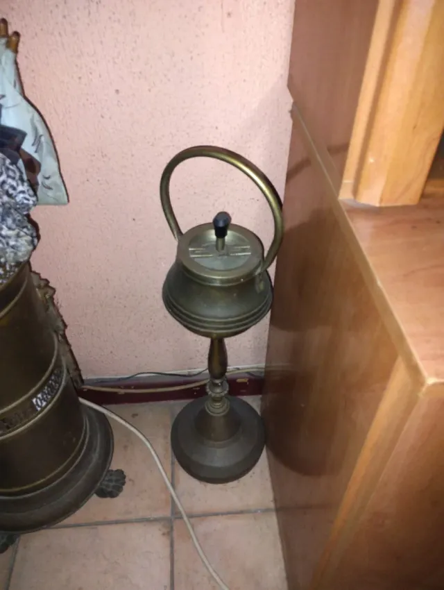 Cenicero de pie con un diseño artesanal y un acabado metálico. - Base redonda y estable. - Cuerpo con detalles. - Asa superior. - Palo central.